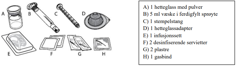 Se andre siden av pakningsvedlegget for avsnitt 7. Instruksjoner for klargjøring og administrasjon.