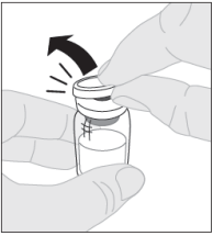 8. Knekk av det hvite, barnesikrede plastlokket fra sprøyten med væske, ved å bøye det perforerte lokket til det knekker av. Legg lokket til side ved å plassere det med toppen ned på en jevn overflate. Ikke berør innsiden av lokket eller sprøytetuppen.