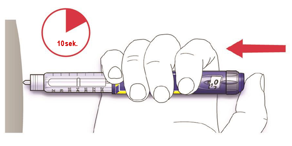 D. Hold injeksjonsknappen helt inne. Tell sakte til 10 før du trekker kanylen ut. Dette sikrer at hele dosen blir injisert.
