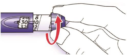 B. Velg den dosen du trenger (i eksempelet nedenfor er den valgte dosen 30 enheter). Dersom du vrir forbi din dose kan du vri tilbake igjen.