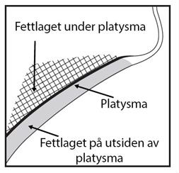 Unngå injeksjon i platysma. Forut for hver behandling palperes det submentale området for å sikre tilstrekkelig submentalt fett, og for å identifisere subkutant fett mellom dermis og platysma (fettlaget på utsiden av platysma) innenfor det ønskede behandlingsområdet (figur 2).