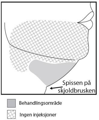 Ikke injiser i en region som er definert ved en 1-1,5 cm linje under den nedre grensen (fra kjevens bakre vinkel til mentum).
