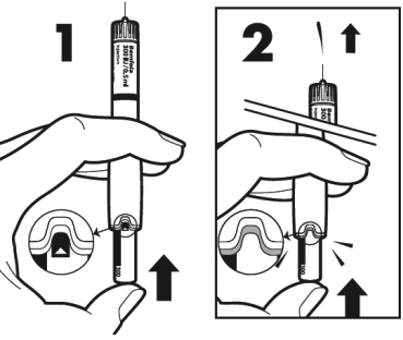 Mens du holder pennen slik at nålen peker oppover, trykk inn doseringsknappen til aktiveringsstreken forsvinner. Du vil også høre et klikk fra pennen, og en liten væskemengde spruter ut (dette er normalt). Pennen er nå klar til injisering av dosen.