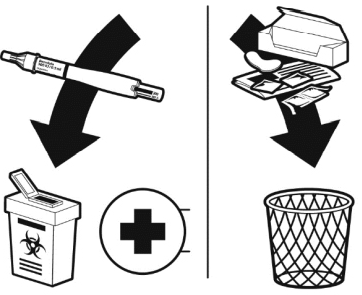 Kast pakningen, den indre nålehetten, den avrivbare fliken, spritservietten og bruksanvisningen i vanlighusholdningsavfall. Legemidler skal ikke kastes i avløpsvann eller sammen med husholdningsavfall. Brukte penner skal kastes i en egnet beholder for skarpe gjenstander og returneres til apoteket for forsvarlig destruksjon. Spør på apoteket hvordan du skal kaste legemidler som du ikke lenger bruker.