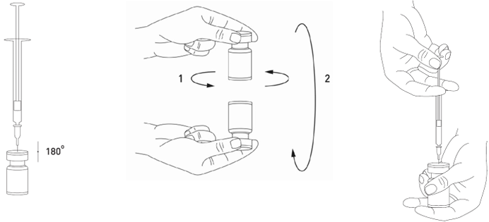 Det er god praksis å rekonstituere hetteglassets innhold og tilberede sprøyten over plastbelagte papirhåndklær for å fange opp søl. Nødvendig mengde natriumkloridoppløsning trekkes opp i en sprøyte. En 20-27 gauge kort skrå nål anbefales til rekonstituering. Etter vertikal innføring av nålen gjennom gummiproppen, injiseres væsken forsiktig i hetteglasset for å unngå skumdannelse.