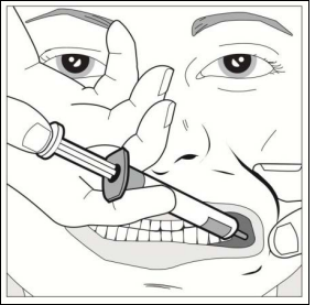 All oppløsning skal sprøytes langsomt inn i rommet mellom tannkjøttet og kinnet (munnhulen).