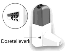 Dosetelleren viser hvor mange doser som er igjen. Telleren flytter seg for hvert femte trykk. Når dosetellereren begynner å bli rød, er det 20 doser igjen.