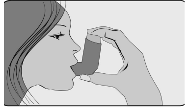 5. Rett etter at du starter å puste inn gjennom munnen, presser du ned på toppen av inhalatoren med pekefingeren for å utløse en dose av legemidlet, mens du fortsatt puster sakte og dypt inn. Pass på at dosen med legemiddel ikke slipper ut på over-, undersiden av munnen eller i munnvikene.