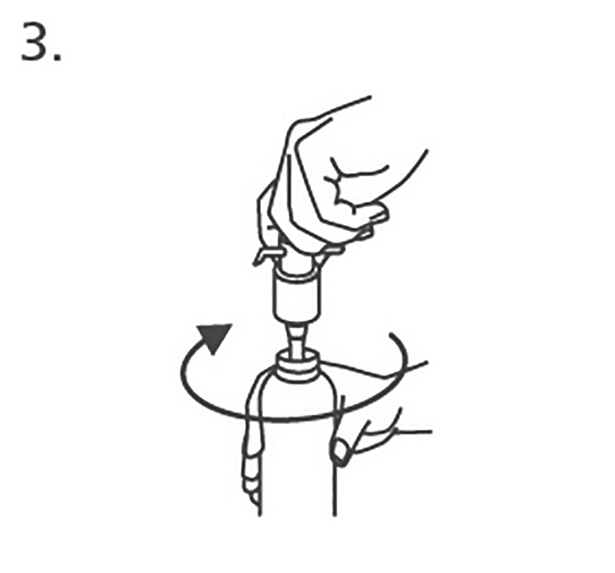 Pumperøret av plast føres forsiktig ned i flasken. Hold doseringspumpen fast mot flasken og skru med klokken inntil den er ordentlig festet (figur 3). Doseringspumpen trenges kun å skrus på før første gangs bruk og skal aldri fjernes.