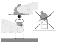 6. Sett hetteglasset på en jevn overflate. Hold hetteglassadapteren i beskyttelseshetten og plasser den rett over toppen av hetteglasset. Trykk bestemt ned til adapteren smekker på plass på toppen av hetteglasset, og spissen på adapteren har trengt igjennom proppen på hetteglasset.