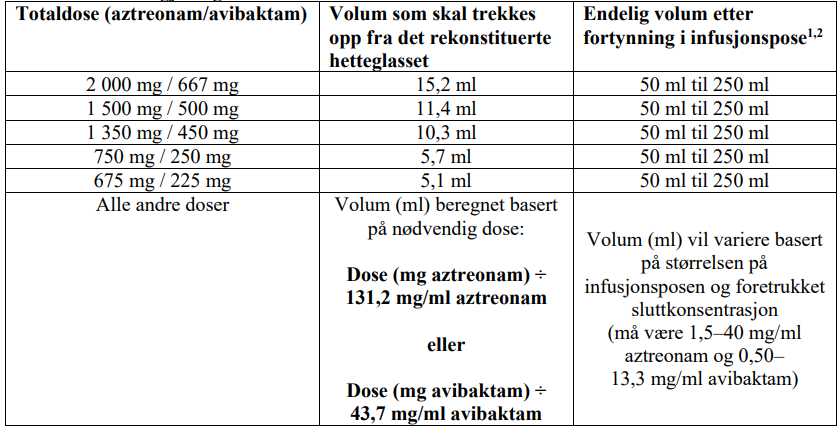 MERK: Følgende prosedyre beskriver trinnene for å klargjøre en infusjonsoppløsning med en sluttkonsentrasjon på 1,5-40 mg/ml aztreonam og 0,50-13,3 mg/ml avibaktam. Alle beregninger skal fullføres før man starter på disse trinnene.
