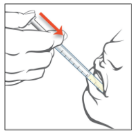 7. Plasser tuppen til oralsprøyten inne i munnen, mot kinnet, og skyv stempelet forsiktig inn, slik at legemidlet sprøytes ut. Ikke bruk kraft på stempelet, og ikke sikt bak i munnen eller mot svelget med sprøytetuppen.