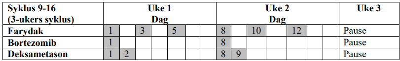 Basert på din leges anbefaling, er Farydak-dosen enten 20 mg eller 15 mg eller 10 mg, og tas én gang daglig på dag 1, 3, 5, 8, 10 og 12 i løpet av en syklus på 21 dager.