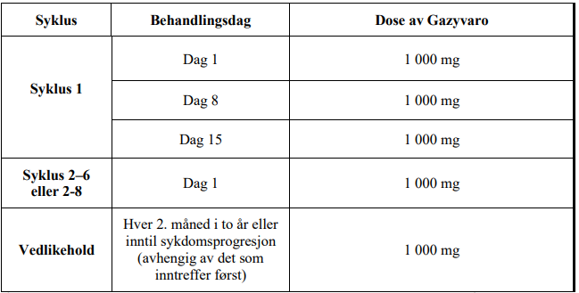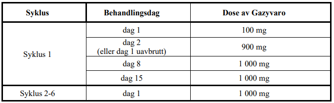 Anbefalt dosering av Gazyvaro er 1 000 mg administrert intravenøst, i henhold til tabell 4: