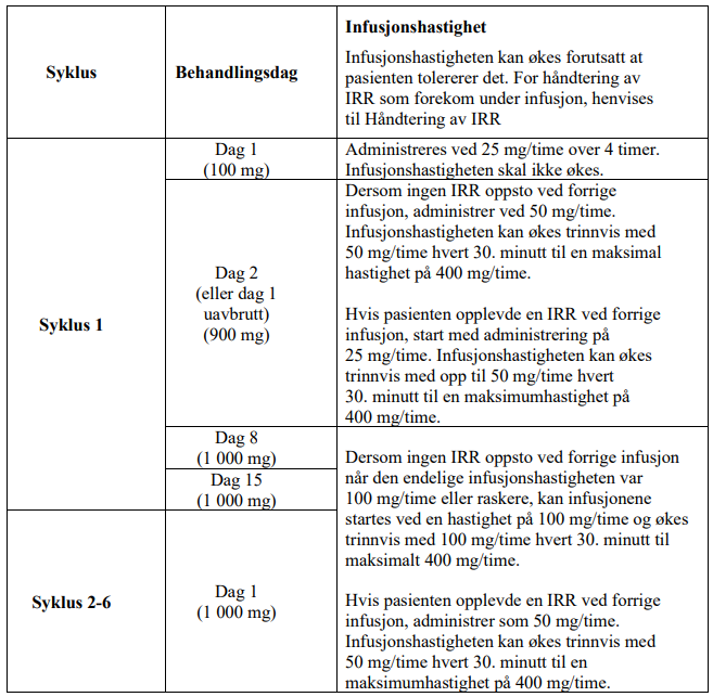 Administreres med en hastighet på 50 mg/time. Infusjonshastigheten kan økes i trinn på 50 mg/time hvert 30. minutt til maksimalt 400 mg/time. For håndtering av IRR som oppstår under infusjon, se "Håndtering av IRR".