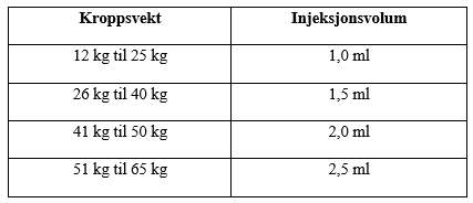 Nødvendig injeksjonsvolum i ml trekkes opp i en tom, gradert sprøyte på 3 ml (se tabellen nedenfor).
