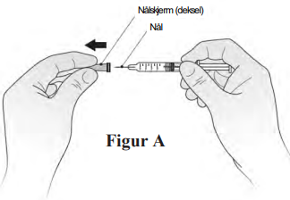 1. Hold i sprøyten, og ta forsiktig beskyttelsen av nålen uten å vri. Trekk beskyttelsen rett av, som vist i figur A. Ikke berør nålen eller trykk ned stempelet. Destruer nåledekselet umiddelbart.