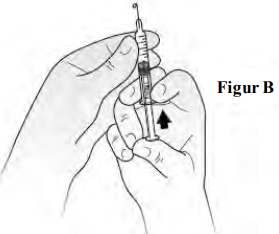 2. Du skal posisjonere sprøyten i én hånd med nålen pekende rett oppover, som vist i figur B. Legg tommelen på stempelstangen og skyv langsomt inntil du ser en liten væskedråpe på spissen av nålen.