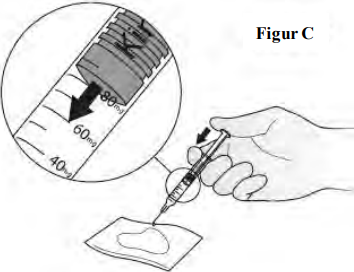 4. Legg tommelen din på stempelstangen og skyv langsomt inntil stempelets front har nådd skalamerket for Kineret-dosen. (Legen din skal ha fortalt deg hvilken dose du skal bruke.) Væsken som kommer ut vil absorberes av gasbindet eller tørkepapiret, som vist i figur C.