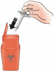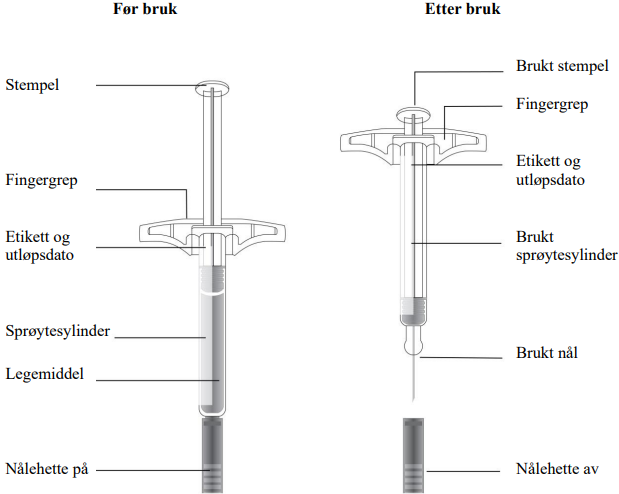 Legg den brukte ferdigfylte sprøyten i en avfallsbeholder for skarpe gjenstander umiddelbart etter bruk.