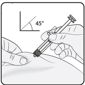 Klem forsiktig sammen huden på injeksjonsstedet og hold fast gjennom hele injeksjonen. Stikk kanylen inn i huden med den andre hånden med omtrent 45 graders vinkel som vist.