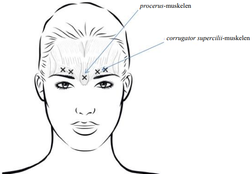 Injeksjoner nær levator palpebrae superioris må unngås for å redusere risikoen for blefaroptosis, særlig hos pasienter med større depressorkomplekser ved øyenbrynene. Når det injiseres på to steder i hver corrugator supercilii-muskel, skal den første injeksjonen settes rett over den mediale kanten på øyenbrynene. Den andre injeksjonen settes omtrent 1 cm over den supraorbitale broen (stive beingrenser som kan kjennes over den øverste delen av det øvre øyelokket), der midtlinjene til øyenbrynene møter hverandre. Injeksjonsstedet i procerus-muskelen befinner seg rett over midtlinjen til nesebroen, der det dannes horisontale rynker mellom de mediale endene til øyenbrynene. Når man injiserer i de mediale endene på corrugator supercilii-musklene og i midtlinjene til øyenbrynene, bør injeksjonsstedene være minst 1 cm fra den supraorbitale broen (stive beingrenser som kan kjennes over den øverste delen av det øvre øyelokket).