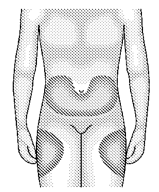De mest egnede stedene for injisering på deg selv er vist her: Øverst på lårene og i magen, unntatt området rundt navlen. Hvis det er en annen som setter sprøyten på deg, kan de også bruke de ytre områdene av overarmene eller seteballene.