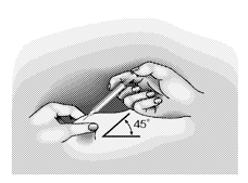 2. Trykk nålen helt inn i huden i ca. 45º vinkel, som vist på bildet.
