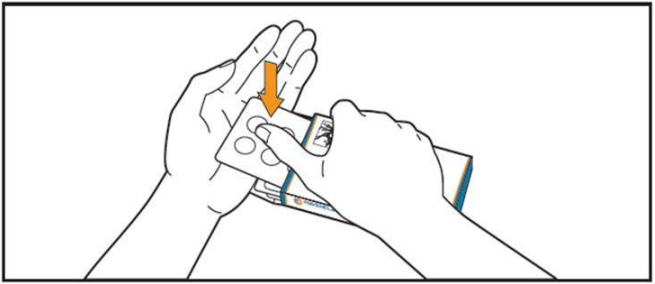 5. Hev blisterpakningen ved å skyve fingeren gjennom hullet i brettet. Hold hånden under blisterpakningen og trykk ut 1 eller 2 tablett(er) i hånden, i henhold til den forskrevne dosen din.