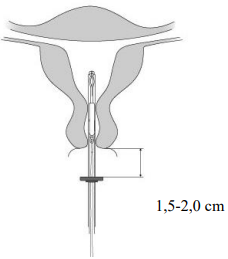 4. Mens glideren holdes i ytterste posisjon, føres innføringshylsen videre inn i cervix inntil måleringen er ca. 1,5-2,0 cm fra uterin cervix (Figur 4).