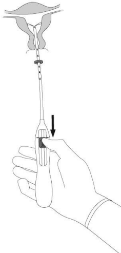 6. Før innføringshylsen forsiktig videre mot fundus i uterus inntil måleringen berører cervix. Mirena er nå plassert ved fundus. (Figur 6).
