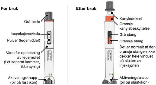 Pennen inneholder to kamre, ett med legemiddel (pulveret) og ett med vann for oppløsning av pulveret.