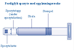 Advarsel: Den ferdigfylte sprøyten er laget av glass, og er utformet til å passe sammen med standard koblinger med luer-lås. Noen nålefrie koblinger som har en innvendig spiss passer ikke sammen med den ferdigfylte sprøyten. Denne uforlikeligheten kan hindre administrering av legemidlet og/eller føre til at den nålefrie koblingen skades.