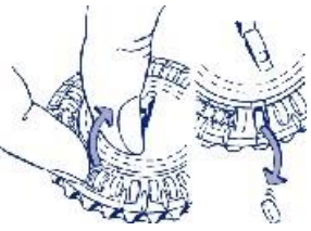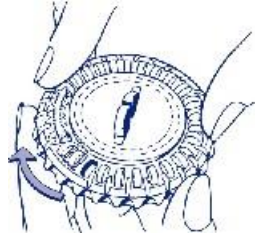 Neste dag dreies den gjennomsiktige ytre skiven med klokken 1 plass som vist med pilen. Vipp ut neste tablett. Husk å ta kun 1 tablett én gang daglig.