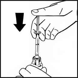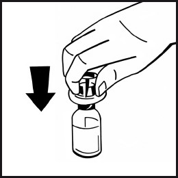 Sett hetteglasset med pulver på en jevn overflate og hold det fast. Ta tak i pakningen med adapteren og plasser hetteglassadapteren over midten av gummiproppen på hetteglasset med pulver. Trykk adapterpakningen bestemt ned til adapterspissen trenger igjennom gummiproppen. Adapteren vil da klikke på plass på hetteglasset.