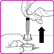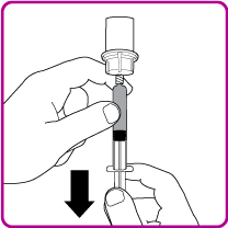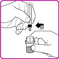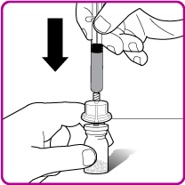 Skyv stempelet ned for sakte å injisere all oppløsningsvæsken fra sprøyten til OBIZUR-hetteglasset.