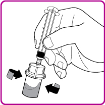 Hold hetteglasset og hetteglassadapteren med én hånd, og bruk den andre til å ta godt tak i sylinderen til den ferdigfylte sprøyten. Skru sprøyten fra hetteglasset ved å bevege den mot klokken (figur H).