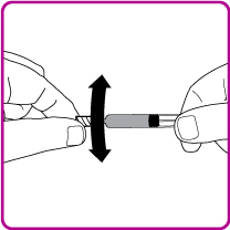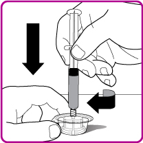 Mens du holder fast hetteglassadapterpakningen kobler du den ferdigfylte sprøyten med oppløsningsvæske til hetteglassadapteren ved å skyve sprøytespissen ned på Luer-locken i midten av hetteglassadapteren og vrir den med klokken til sprøyten er festet på plass. Ikke stram til for hardt (figur D).