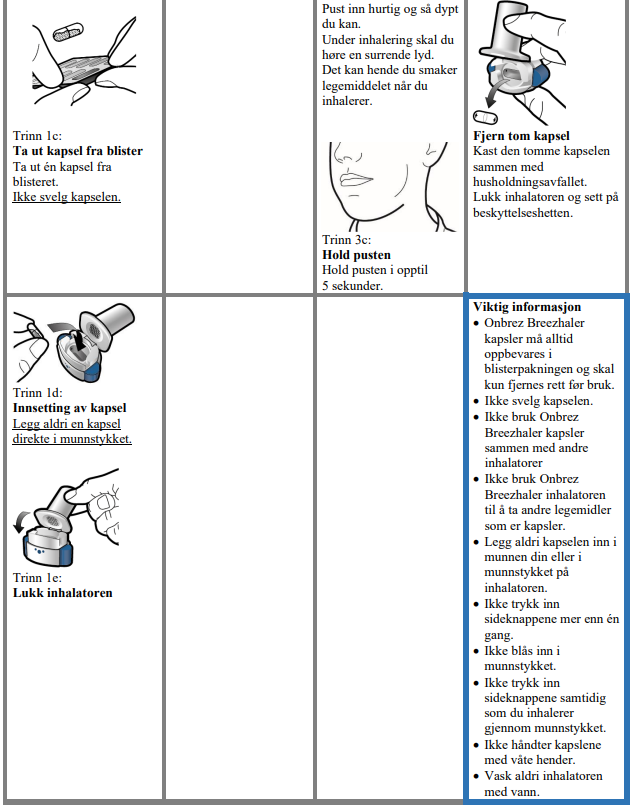 Bruk kun kapslene sammen med inhalatoren vedlagt i denne pakningen (Onbrez Breezhaler inhalator). Kapslene skal være i blisteren til du skal bruke dem.