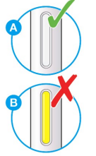 Kontroller at væsken er klar og fargeløs til svakt gul og uten partikler (se bilde A).