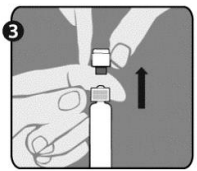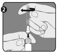 Etter fullført rekonstituering av vaksinen fjerner du lokket fra den andre nålen (som beskrevet i trinn 1 for nålene) og bytter ut nålen som ble brukt til rekonstituering med den andre nålen som skal brukes til administrasjon. Ikke bruk den samme nålen til rekonstituering og administrasjon.