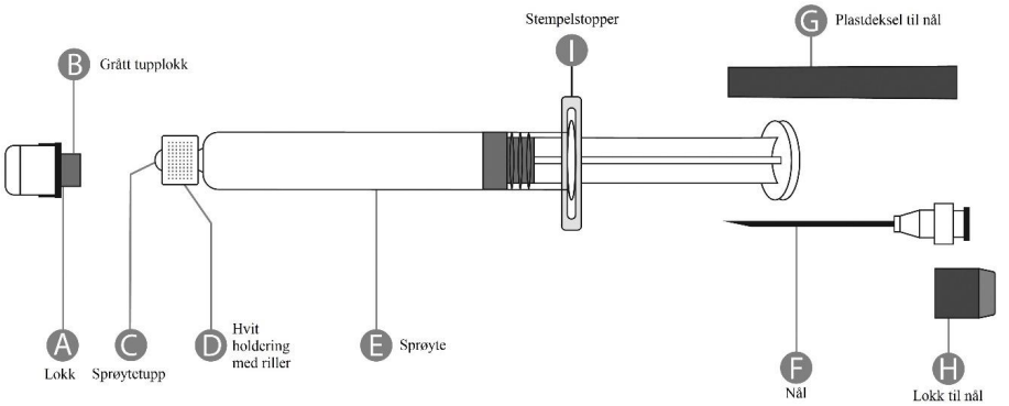 Oppbevar hetteglasset og sprøyten i ytteremballasjen for å beskytte mot lys.
