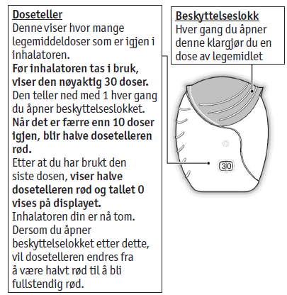 Hvis dosetelleren ikke teller ned når du hører et “klikk”, vil inhalatoren ikke avgi noe legemiddel.