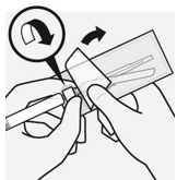 Hold den sterile blisterpakningen som vist. Trekk papirbeskyttelsen tilbake, og fjern den. Ikke ta hetteglassadapteren ut av blisterpakningen.