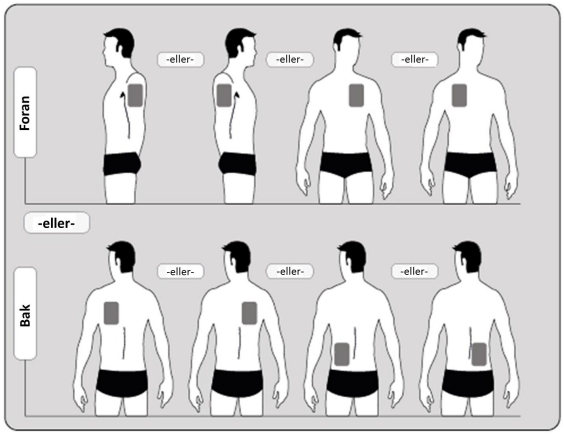 Hver 24. time skal det forrige plasteret fjernes før ETT nytt plaster plasseres på KUN ETT av de følgende mulige stedene.