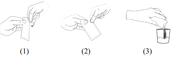 Åpne dosepose(e) med Sapropterin Dipharma -pulver til mikstur, oppløsning, ved å brette (1) og rive (2), eller kutt den stiplede streken i øvre delen av doseposen.