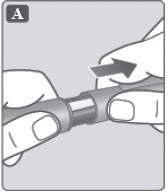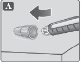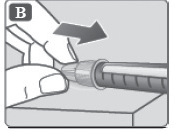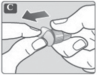 Nålen er dekket av to hetter. Du må fjerne begge hettene. Dersom du glemmer å fjerne begge hettene, vil du ikke få injisert noe oppløsning