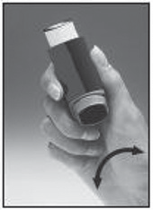 2. For å være sikker på at den virker, rist inhalatoren godt, hold munnstykket slik at det peker fra deg og trykk på beholderen for å frigjøre to doser i luften. Det samme bør gjøres dersom du ikke har brukt inhalatoren på 1 uke eller mer.