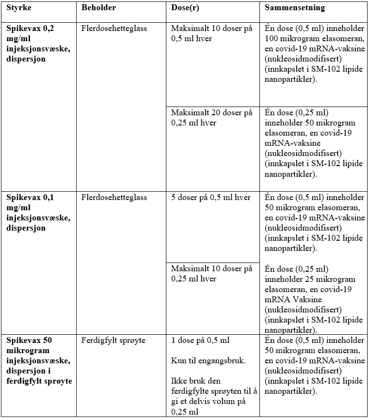Spikevax leveres som en dose til engangsbruk, ferdigfylt sprøyte (uten kanyle) inneholder 0,5 ml (50 mikrogram) mRNA og må tines før administrering.