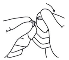 Hold ampulletoppen med den andre hånden, med pekefingeren på ampullehalsen og tommelen på den fargede prikken parallelt med de(n) fargede identifiseringsringen(e).